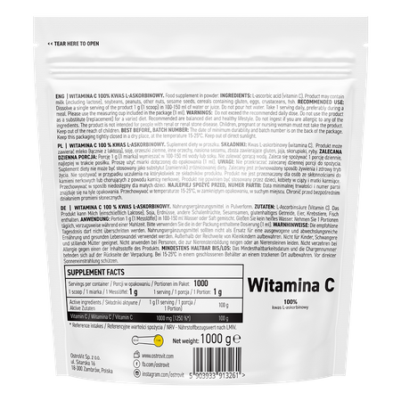 OstroVit Vitamina C es un complemento alimenticio de calidad superior que constituye una fuente de ácido L-ascórbico. Se trata de un producto en polvo que sólo contiene una sustancia, sin aditivos ni cargas innecesarias. Se trata de un producto creado para personas físicamente activas y con una mayor necesidad de vitamina C, que satisface las elevadas exigencias de los consumidores.