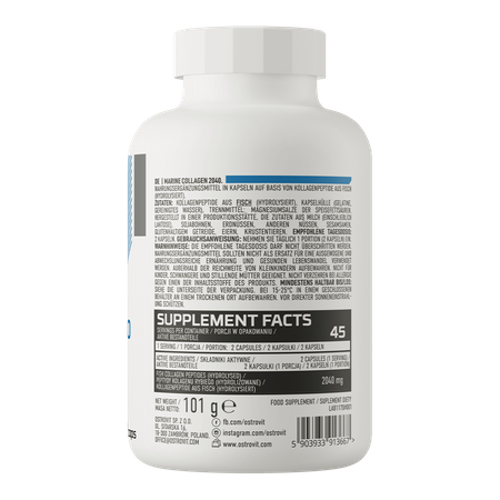 Dado que el nivel de colágeno en el cuerpo disminuye con la edad debido a los procesos naturales de envejecimiento, vale la pena complementar el cuerpo con colágeno de fuentes externas. El colágeno se encuentra en huesos y tendones de animales, entre otros lugares, y también está disponible en forma de suplementos dietéticos. El colágeno marino tipo I utilizado en OstroVit es una fuente de péptidos de colágeno de pescado hidrolizados, cuya estructura se asemeja al colágeno humano. Esto, a su vez, hace que la sustancia El colágeno marino de tipo I utilizado en el preparado OstroVit es una fuente de péptidos de colágeno de pescado hidrolizados, cuya estructura se asemeja al colágeno humano. Esto, a su vez, hace que la sustancia destaque por su excelente biodisponibilidad en el cuerpo humano y hace que funcione de manera más eficaz que otras formas del compuesto.