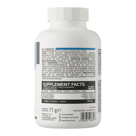 Las cápsulas de L-tirosina de 500 mg de OstroVit son un suplemento dietético de alta calidad que es una fuente de L-tirosina. Es un preparado disponible en forma de cápsulas fáciles de tragar, creado para personas que desean complementar su dieta con este valioso compuesto.