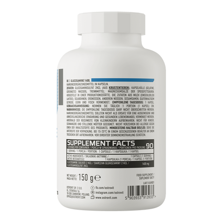 OstroVit Glucosamina 1400 mg es un complemento alimenticio en forma de cápsulas que es una fuente de sulfato de glucosamina, una sustancia que es fácilmente absorbida por el cuerpo humano. Es un suplemento dietético de alta calidad, recomendado especialmente para deportistas y personas con un estilo de vida activo.