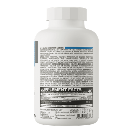 OstroVit Creatina Monohidrato es un suplemento dietético de alta calidad que contiene creatina en forma de monohidrato. Está disponible en forma de comprimidos fáciles de tragar, diseñados para deportistas y personas físicamente activas que necesitan complementar su dieta con el valioso compuesto.
