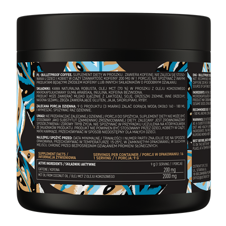 - Fuente de ingredientes valiosos - una ración del producto aporta al organismo 200 mg de cafeína y 2000 mg de aceite MCT.