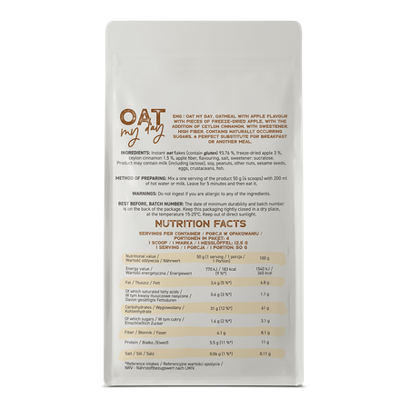 OstroVit Oat My Day es una nutritiva harina de avena que destaca por su riqueza en fibra dietética. El producto no contiene azúcares añadidos y debe su sabor dulce a los trozos de fruta natural liofilizada y a la sucralosa, un edulcorante de bajo valor energético. Disponible en cuatro sabores diferentes, la mezcla es una solución que satisfará el apetito y las preferencias individuales del consumidor, mientras que la sencillez y el breve tiempo de preparación permitirán disfrutar de un tentempié sabroso y saludable incluso durante un día ajetreado.