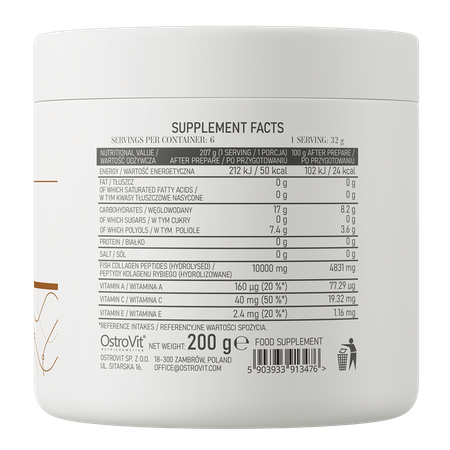 El nivel de colágeno en el cuerpo disminuye con la edad debido a los procesos naturales de envejecimiento del organismo. Sin embargo, las proteínas pueden obtenerse de huesos o tendones de animales. El compuesto utilizado en OstroVit Colágeno Kissel es colágeno marino de tipo I, también conocido como colágeno de pescado, que tiene una estructura similar al colágeno que se forma de forma natural en el cuerpo humano y se considera uno de los tipos de compuestos más eficaces.