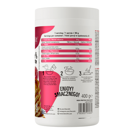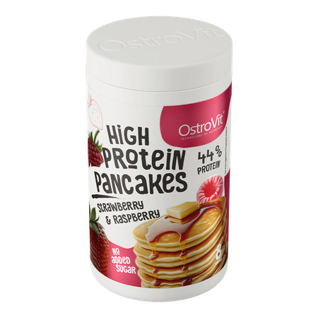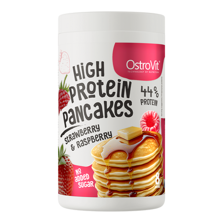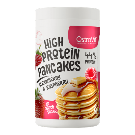 OstroVit High Protein Pancakes es una mezcla para la preparación independiente de tortitas y gofres ricos en proteínas. Es un preparado con sabor afrutado, a fresa y frambuesa, que se distingue por su alto contenido en proteínas. Es un producto sin azúcares añadidos, ideal como valioso suplemento dietético para deportistas y personas con una mayor necesidad de proteínas.