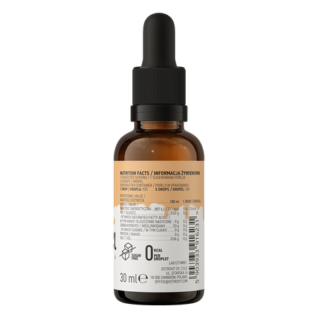 Sweetener Drops de OstroVit es un producto de alta calidad que destaca por su delicioso sabor a caramelo que se derrite en la boca. Es un preparado sin azúcares añadidos, que aporta gran variedad al sabor de las bebidas. Es un gran suplemento, hecho para personas que quieren una dieta sana pero sabrosa.