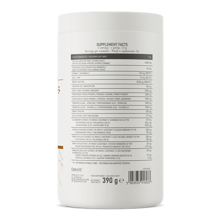 Péptidos de colágeno de pescado (hidrolizados), fibra de manzana, hierba de cebada joven en polvo, hierba de trigo joven en polvo, alga espirulina en polvo (Spirulina platensis (Gomont) Geitler), alga clorela en polvo (Chlorella pyrenoidosa), inulina de achicoria (prebiótico), lecitina de soja, extracto de saúco (Sambucus nigra L.) - 40% polifenoles y 5% antocianinas, extracto de hoja de té verde (Camellia sinensis L.) - 50% polifenoles, extracto de rizoma de cúrcuma (Curcuma longa L.) - 95% curcuminoides, ubiquinona (coenzima Q10), ácido L-ascórbico (vitamina C), antiaglomerante: dióxido de silicio; regulador de la acidez: ácido cítrico; picolinato de zinc (zinc), extracto de semilla de uva (Vitis vinifera L.) - 95% proantocianidinas (PAC), extracto de las hojas del árbol de ginkgo (Ginkgo biloba L.) - 24% ginkgoflavonglicósidos y 6% lactonas terpénicas, aromas, ácido hialurónico (hialuronato de sodio), edulcorantes: sucralosa, acesulfamo K; colorante: carotenos; D-biotina (biotina).