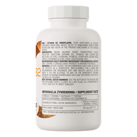 OstroVit Vitamina B2 Riboflavina es un complemento alimenticio de alta calidad que proporciona una fuente de riboflavina. Disponible en forma de cápsulas fáciles de tragar, se ha desarrollado para quienes desean complementar su dieta diaria con el valioso micronutriente.