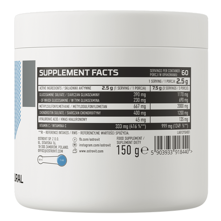 - Fuente de ingredientes valiosos - una ración diaria del complemento alimenticio aporta al organismo 1170 mg de sulfato de glucosamina 2KCL, 2000 mg de metilsulfonilmetano, así como 1200 mg de sulfato de condroitina, 135 mg de ácido hialurónico y 999 mg de vitamina C.