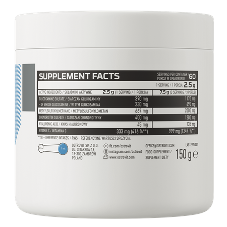 - Fuente de ingredientes valiosos - una ración diaria del complemento alimenticio aporta al organismo 1170 mg de sulfato de glucosamina 2KCL, 2000 mg de metilsulfonilmetano, así como 1200 mg de sulfato de condroitina, 135 mg de ácido hialurónico y 999 mg de vitamina C.