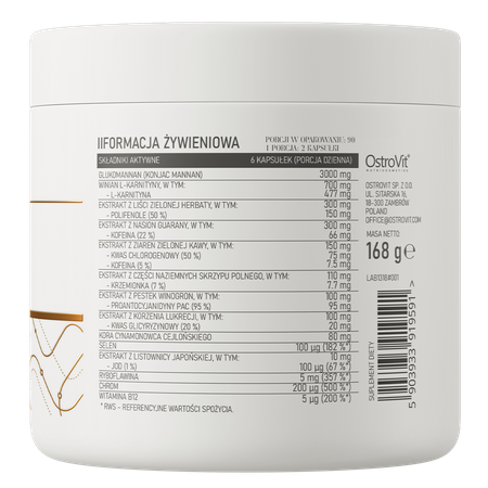 - Fuente de 14 valiosos compuestos - el suplemento dietético aporta al organismo glucomanano, tartrato de L-carnitina, extractos de té verde, semillas de guaraná y granos de café verde, así como extractos de las partes molidas de cola de caballo de campo, semillas de uva y raíz de regaliz. El producto también contiene corteza de canela de Ceilán, selenio, extracto de hoja japonesa y riboflavina, cromo y vitamina B12.
