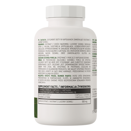 - Contiene extracto de las partes aéreas de la planta de alfalfa - una porción del complemento alimenticio aporta al organismo 500 mg de extracto de alfalfa.
