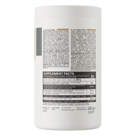 - Fuente de ingredientes valiosos - una ración del suplemento dietético aporta al organismo 8.000 mg de colágeno hidrolizado de vacuno, 3.400 mg de monohidrato de creatina, 500 mg de vitamina C, así como 3.000 mg de L-glutamina y 1.000 mg de taurina.