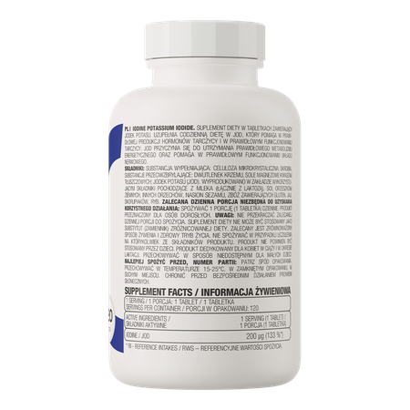 OstroVit Yodo Yoduro Potásico 200 μg es un complemento alimenticio de alta calidad que proporciona una fuente de yodo en forma de yoduro potásico. Está disponible en forma de comprimidos fáciles de tragar, diseñados para personas que necesitan complementar su dieta diaria con el valioso compuesto.