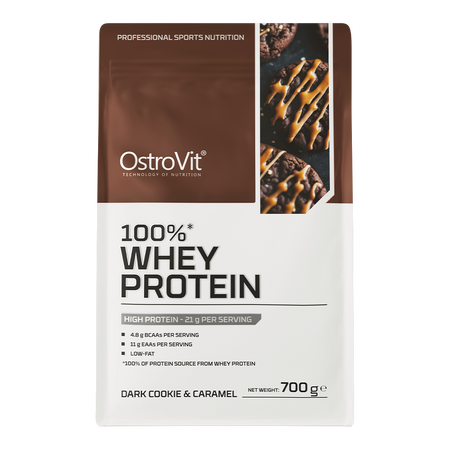 OstroVit 100% Whey Protein es un suplemento dietético que es una fuente de concentrado de proteína de suero, que contiene hasta un 70% de proteína de alta calidad. Es una fórmula que aporta al organismo aminoácidos de cadena ramificada BCAA, así como aminoácidos esenciales EAA. Se trata de un producto bajo en grasas, disponible en forma de polvo en una variedad de sabores, que ha sido desarrollado para deportistas y personas que desean complementar su dieta diaria con un valioso macronutriente.