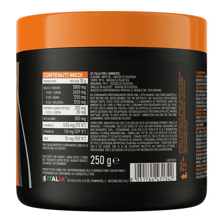 - Contenido de ingredientes activos por ración: 5000 mg de BCAA (2:1:1), 200 mg de Pepform® leucina, 350 mg de beta-alanina, 0,83 mg de vitamina B1, 1,8 mg de vitamina B6 y 15 mg de zinc.