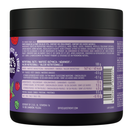 - NÚMERO MÍNIMO DE CALORÍAS - 100 g de nuestra jalea de frutas del bosque OstroVit tienen aproximadamente 40 kcal, mucho menos que 100 g de mermelada o confitura de fruta normal. Puede disfrutar de su sabor sin remordimientos: es adecuado para quienes se preocupan por los platos bajos en calorías.
