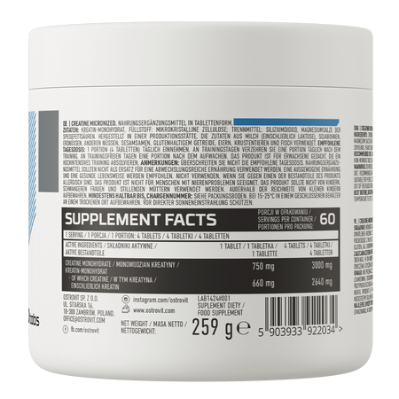 OstroVit Creatina Micronizada es un suplemento dietético de alta calidad que contiene monohidrato de creatina micronizado. Está disponible en forma de comprimidos fáciles de tragar, diseñados para atletas y personas físicamente activas que desean complementar su dieta con este valioso compuesto.