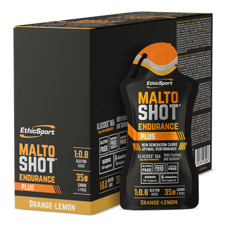 La fórmula del producto MaltoShot® Endurance PLUS se basa en carbohidratos con un perfil de absorción variado, procedentes de cinco fuentes, entre ellas la ciclodextrina ramificada SusCarb®, obtenida mediante un proceso de transformación enzimática del almidón. Este suplemento, con un delicioso sabor a naranja y limón, tiene una proporción de glucosa y fructosa de 1:0,8. La composición del preparado se ha complementado con minerales como el sodio y el magnesio, así como con beta-alanina, un compuesto químico orgánico que pertenece al grupo de los aminoácidos no proteicos. El producto no contiene cafeína añadida.