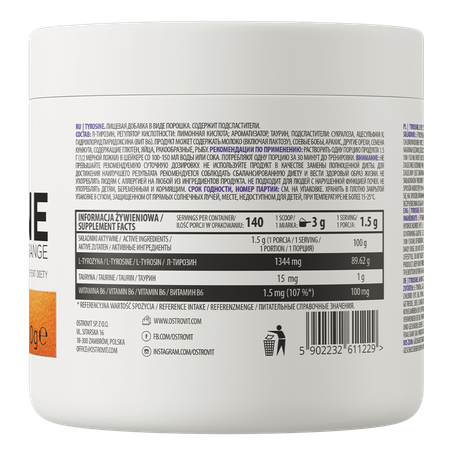OstroVit Tyrosine es un suplemento dietético de alta calidad que proporciona una fuente de tirosina, así como taurina y vitamina B6. Es una fórmula disponible en un cómodo formato en polvo con un delicioso sabor a naranja que no contiene azúcares añadidos. Es un producto creado para consumidores conscientes que desean complementar su dieta con ingredientes valiosos.