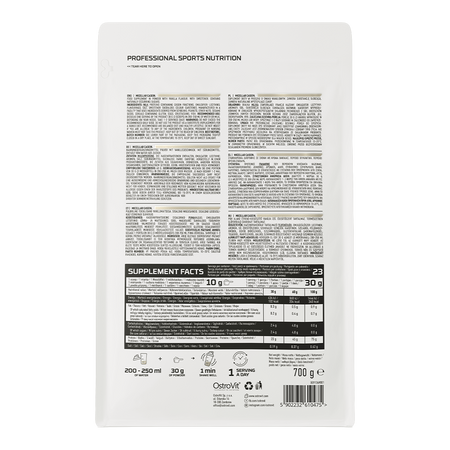 - Fuente de caseína micelar a partir de concentrado de proteínas lácteas - la fórmula contiene un 75% de proteínas y una ración del suplemento dietético aporta al organismo 23 g de proteínas de alta calidad.